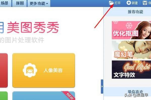 1、想要去除照片上的衣服,首先应该在应用市场现在一个美图秀秀,并且在手机主界面上打开美图秀秀,点右上角“打开”按钮,从中搜索出一张我们要修改的照片