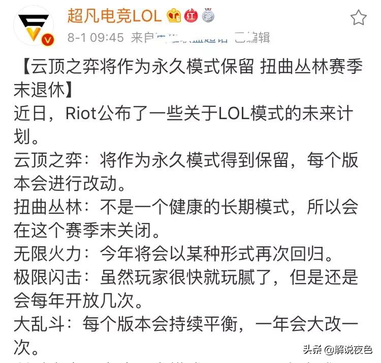 英雄联盟作为一款出游至今九年的游戏,却依旧称霸MOBA类游戏的龙头大哥,凭借着他独特的机制以及精美的画风经久不衰。就在不久前,LOL官方宣布扭曲丛林模式将于“赛季末退休”,云顶之奕将作为永久模式并保留,具体原因还请各位观众老爷跟着夜色一起来看一看!