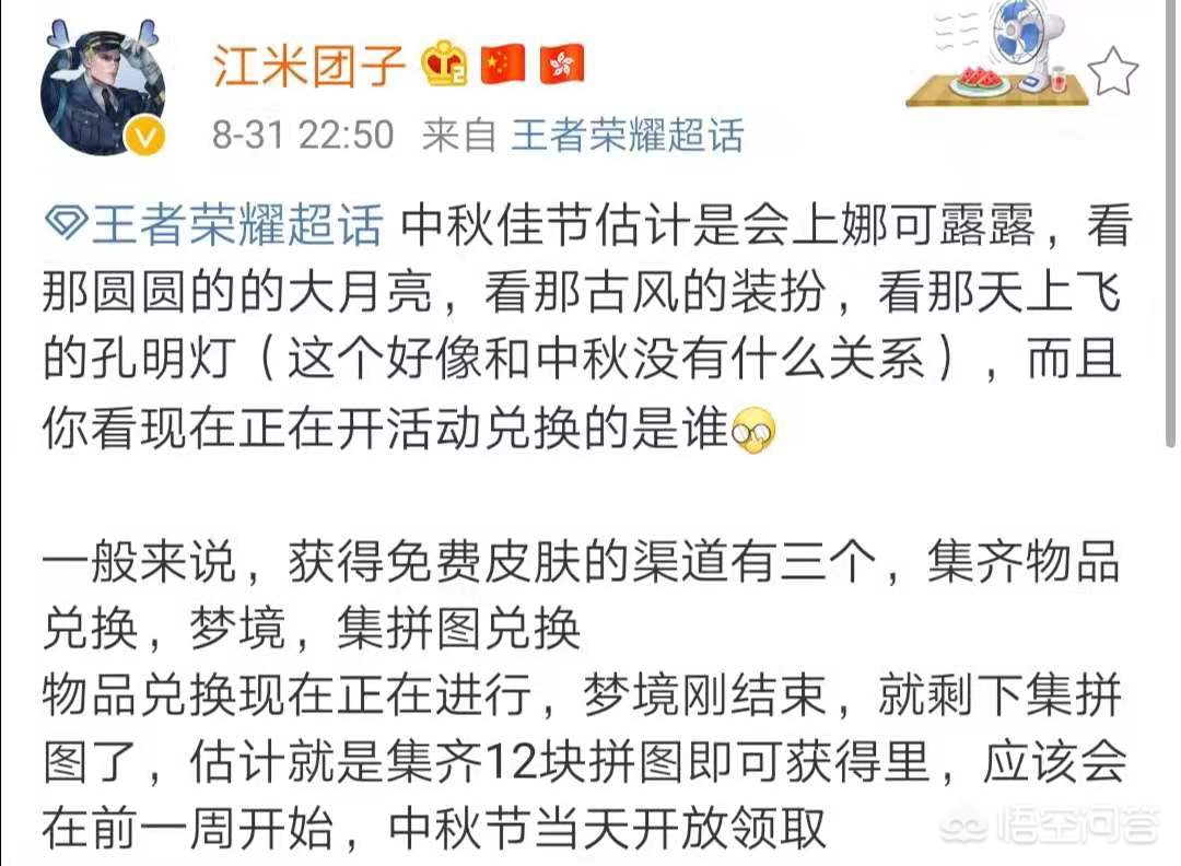 这名大佬还称,现在活得免费皮肤的渠道总共有三个,分别是集齐物品兑换、梦境系统、集拼图兑换,物品兑换现在正在进行,梦境也刚刚结束,现在就只剩下集拼图了,这次会通过集齐12块拼图就能获得,而且会在中秋节的前一周开始,大家就能迎来这个活动,通常正式服更新会在周二,所以说,后天这个活动就会开启,在中秋节当天就能领取到这款皮肤。