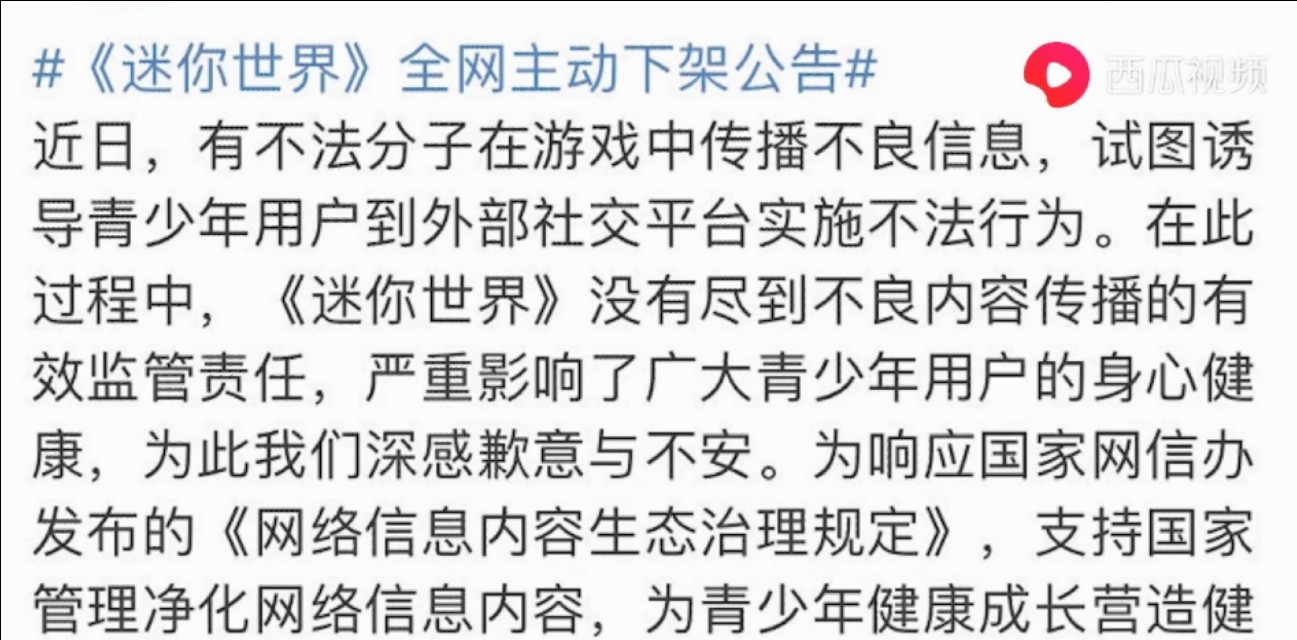 近日,有不法分子在游戏中传播不良信息,试图诱导青少年用户到外部社交平台实施不法行为。在此过程中,《迷你世界》没有尽到不良内容传播的有效监管责任,严重影响了广大青少年用户的身心健康,为此我们深感歉意与不安。为响应国家网信办发布的《网络信息内容生态治理规定》,支持国家管理净化网络信息内容,为青少年健康成长营造健康的网络环境,《迷你世界》即日起主动从全网的各个渠道下架该游戏产品,彻底阻断不良内容传播链条,直至产品整改完毕。