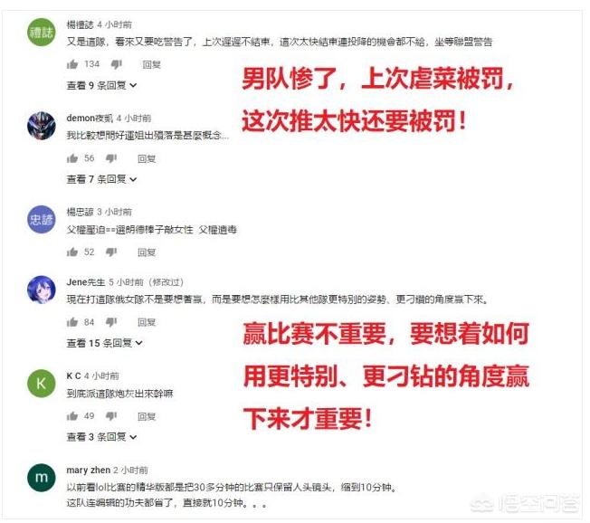 女子战队在职业赛场上屡屡失败只能证明这支战队的游戏水平不咋地,但是不能说明女生玩游戏不如男生。有的女玩家的操作水平还是蛮高的,只不过至今为止还没有在职业赛场上出现过而已。不知道这次拳头会不会再开出罚单了,毕竟这游戏时间太短了,13分钟就推平对面的主基地,就是玩匹配也难以做到的事。