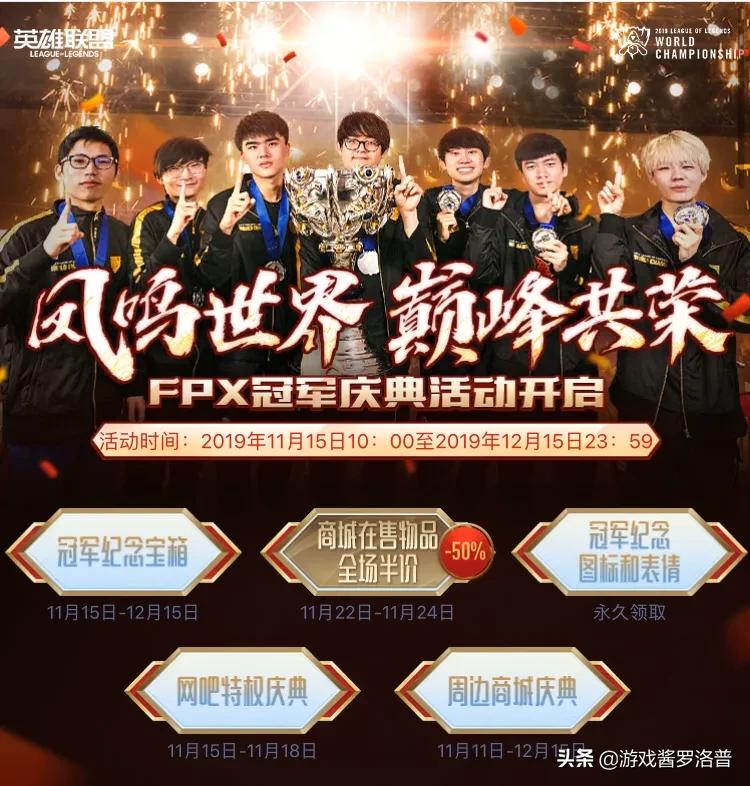 为了庆祝FPX夺冠,官方之前已经做过一次庆典,免费送了所有玩家一个皮肤和图标。不过这还只是第一阶段,第二阶段以及之后的活动才是重头戏——所有商城在售的英雄、皮肤全部半价,这其中包括海克斯皮肤!