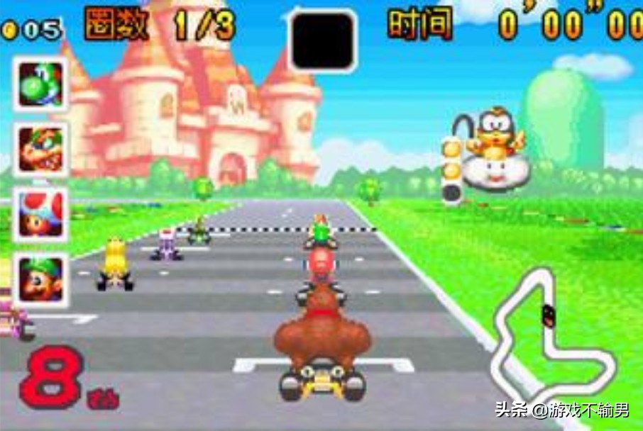 和跑跑卡丁车的玩法一样的哦,就是在赛道上面一边竞速一点害人的,老和电脑玩也没意思,和朋友一起竞技才叫好玩,毕竟坑人的感觉非常爽,这个游戏我忘了支持几个玩家了,GBA是有游戏支持四个玩家的,这个游戏不知道支不支持,其实意义也不大,那个时候想凑齐四个有GBA的伙伴还是挺难的。