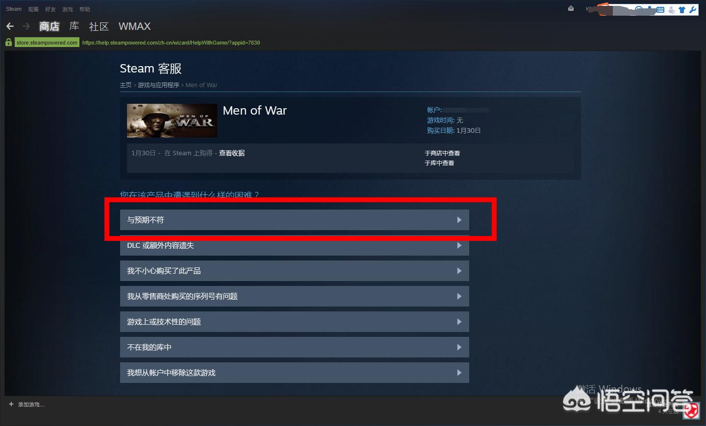 进入客服界面后,选择‘与预期不符’选项。Ps:这步有些同学可能会打不开客服界面,这时只需要登录加速器,加速steam社区/商城就可以。