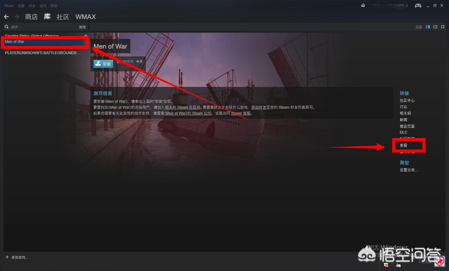 1、在steam上点击要退款的游戏,再点击右边的客服。