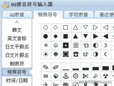 4、点击符号图标,会出现一个QQ拼音符号输入器页面分别有QQ表情特殊符号字符表情最近使用等选项。