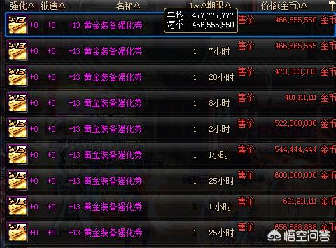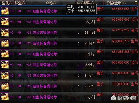 我是跨六的一个小小玩家,也好奇地去拍卖行查看了一个各种几率强化券的价格,结果发现拍卖上只存在两种强化券,分别是+13铂金装备强化券和+13黄金装备强化券,我想不是因为另外两种强化券没有被欧皇玩家开出,而应该是那两种强化券的价格太高,超出了拍卖行的上架金币限制,估计那些顶级强化券都在平台上挂着呢?
