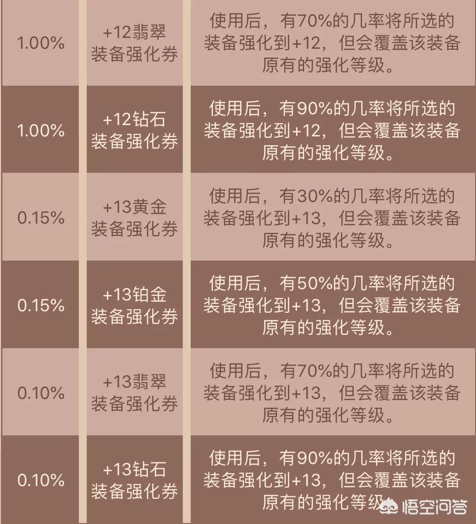 我们主要说一说强化券,商城盒子里新增了一个古古莱恩强化礼盒,打开礼盒,可以以不同的概率获得下列图片中的11-13的强化券,成功几率也分30%,50%,70%和90%四种!