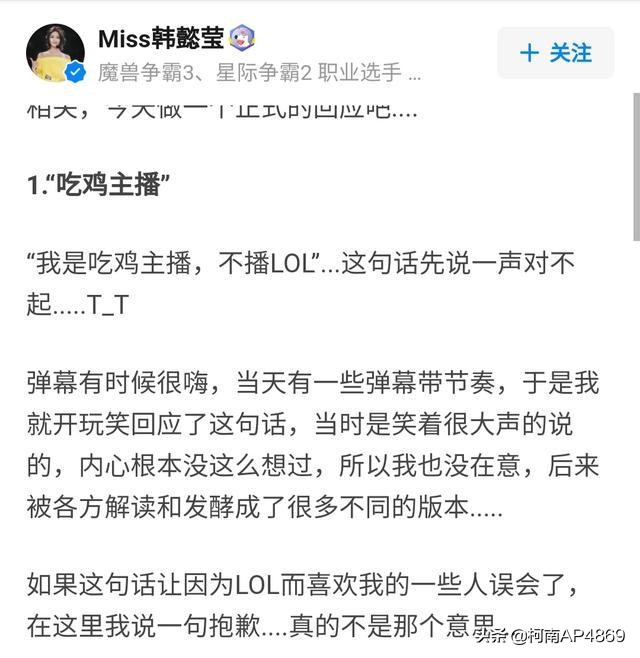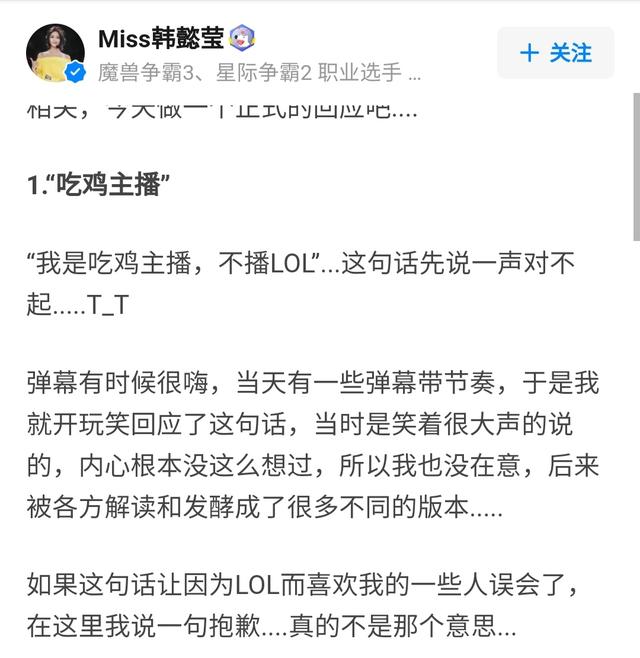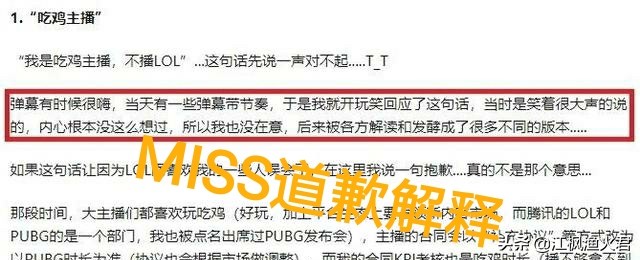 绝大多数的玩家,对于她现在的直播状态是不满意的,所以miss气低迷也登上了热搜,就在最近她也是公开回应了这些事情,第一点她回应的就是曾经的言论,我是吃鸡主播,不播英雄联盟。他也为这个话语道歉了,且表示自己当时并不是这个意思,被一些无良的自媒体曲解之后,也没有办法进行解释了,毕竟越解释越黑,看到这一条诚挚的道歉,许多的粉丝都开始动摇,分分原谅了她!