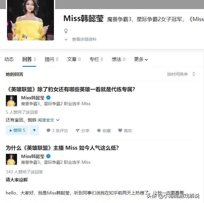 Miss最初以电竞起家,她的《Miss排位日记》曾经也是火到不行,虽然现在依旧在更新,但质量和热度都不可同日而语。在经历了S5、S6期间解说的转型之后,Miss备受质疑,她的解说得不专业程度常常令人听起来很尴尬,后来吃鸡游戏火起来之后又去播吃鸡,抛弃了一大波LOL观众,最后也证明了Miss的选择是多么错误。