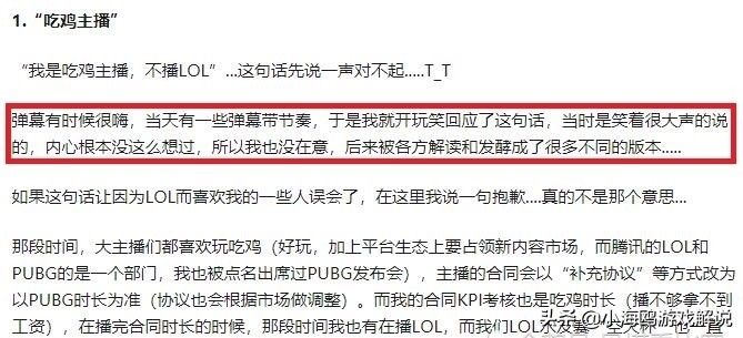 之后她也是解释了一下,当时为什么会离开英雄联盟加入到吃鸡当中,她表示当时吃鸡的加入很多的平台都有着合同,要求顶级主播必须去播吃鸡,而且时长一定要够才可以,当时她也是顶着很多的合同才去转型播起了吃鸡的,时长播不够是不给工资的,字里行间透露着转型成为一名吃鸡主播,并不是她的本意。最后她也是对于粉丝进行了一个诚挚的道歉,现在重新回归到英雄联盟之中,确实人气出现了很大的波动,她自己也在潜心学习,努力的改进自己的缺点,而且她自己也是承认了错误,我相信之后会更好的!