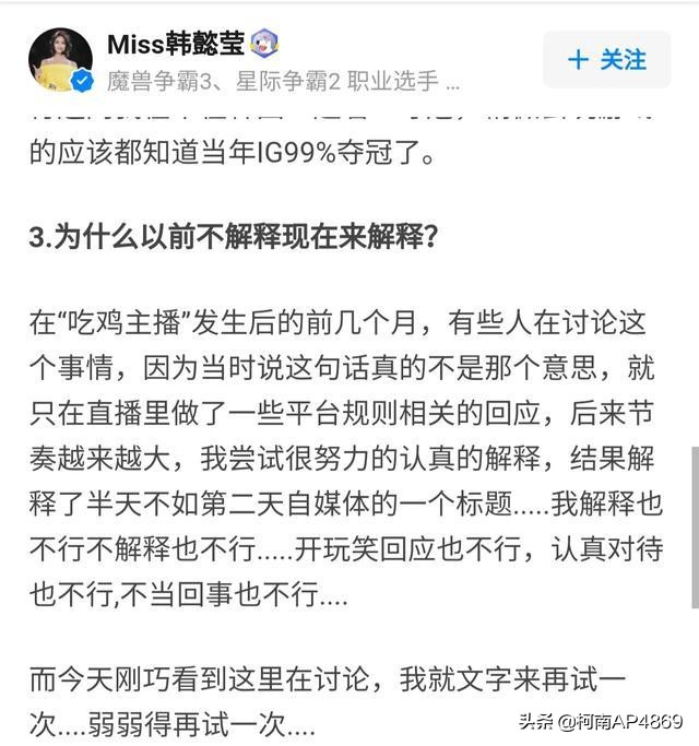 最近,关于MISS的热议又多了起来,吃鸡的问题再次被提起,MISS也在知乎上面,先是道歉,然后回应了为什么去吃鸡的原因。原来当时的平台有规定,大主播们都要去播一下吃鸡,并且设置时长的要求,如果时长时间不达标,就不会发工资。对于这番解释,我认为可信度,还是有那么一点,毕竟人在江湖,身不由己,MISS也不是大家想象的那样,是忘恩负义的人。
