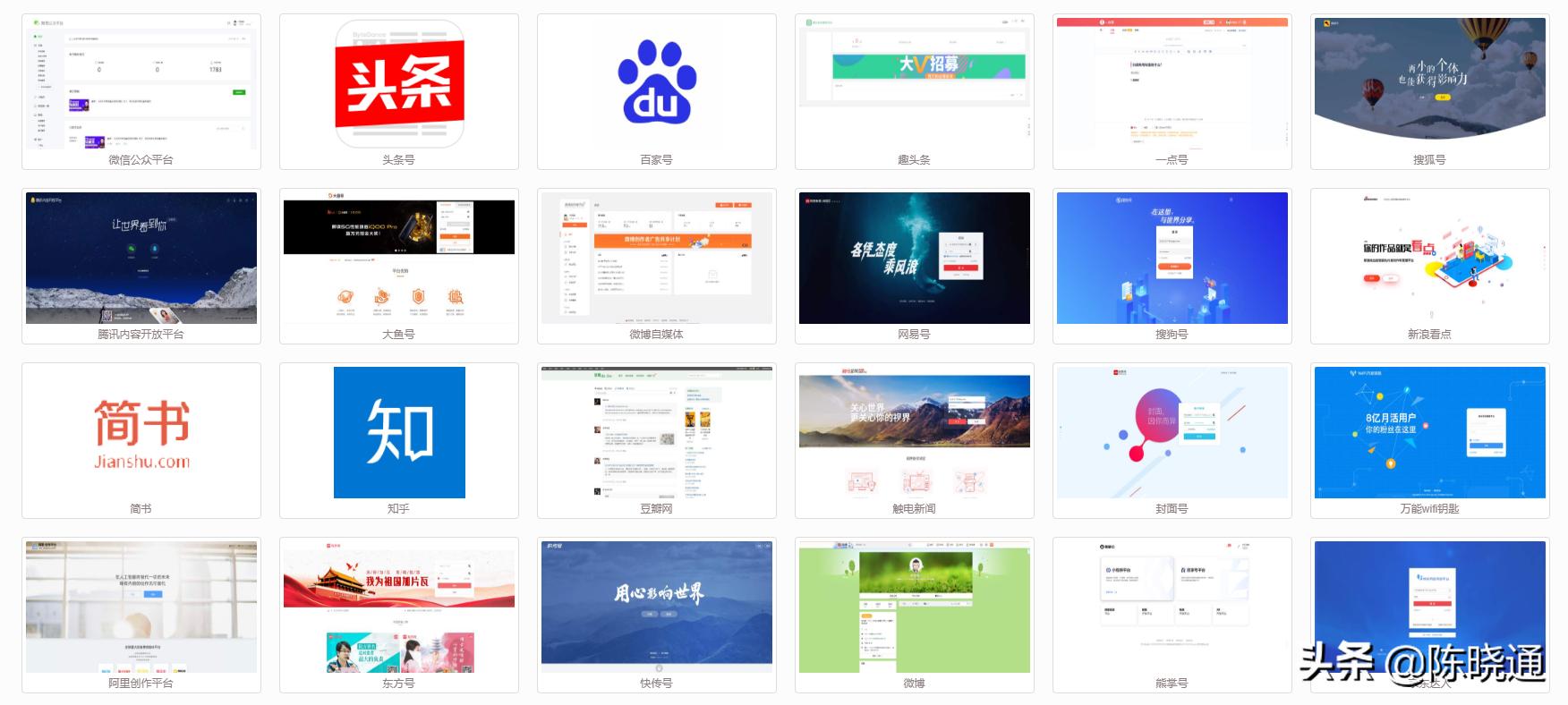 自媒体平台的包括,微信公众号、头条号、百家号、企鹅号、趣头条、一点号/凤凰号、搜狐号、大鱼号、新浪看点、网易号、搜狗号、简书、知乎、豆瓣、触电新闻、封面号、快传号等。