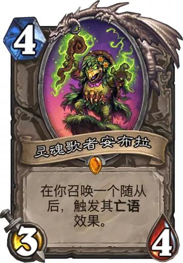 早期这张牌因为亡语套路的没落,暂时没人问津。直到狗头人版本的魔块术这种骚套路的出现,安布雷拉以其强大的能力,契合了虚空领主招亡语蓝胖的combo,成了魔块术对抗快攻的有效手段。