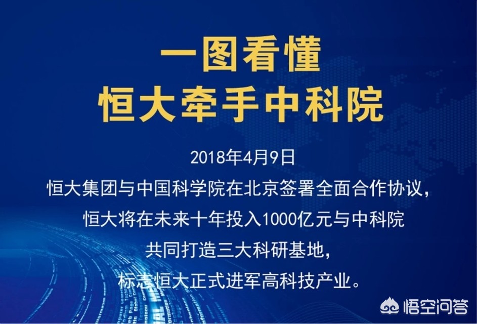 4月9日,恒大集团与中国科学院在北京签署全面合作协议,恒大将在未来十年投入1000亿元与中科院共同打造三大科研基地,标志恒大正式进军高科技产业。