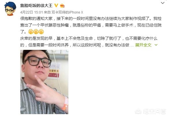 老徐昨日在微博上,通知大家视频需要停更一段时间,原因是因为自己检查出了甲状腺恶性肿瘤,需要马上做手术。万幸的是发现的早,再做手术后修养一段时间,身体恢复了也许就能出院继续为大家做视频了。