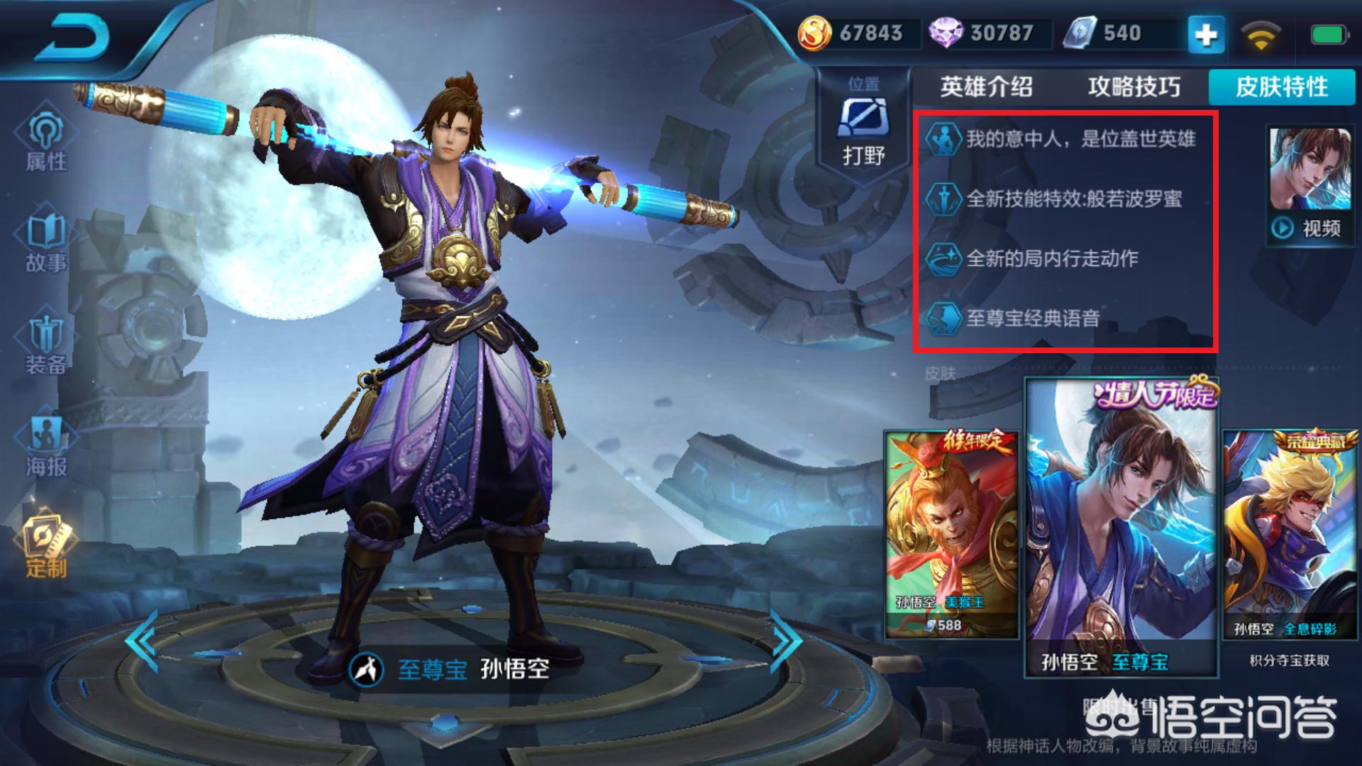 至尊宝这款皮肤是根据大话西游里面的经典型像制作的,技能特效要稍差于地狱火,但是比地狱火更显轻灵,手感要好一些,并且也拥有全新的语音特效,售价888点券,属于是限定皮肤!